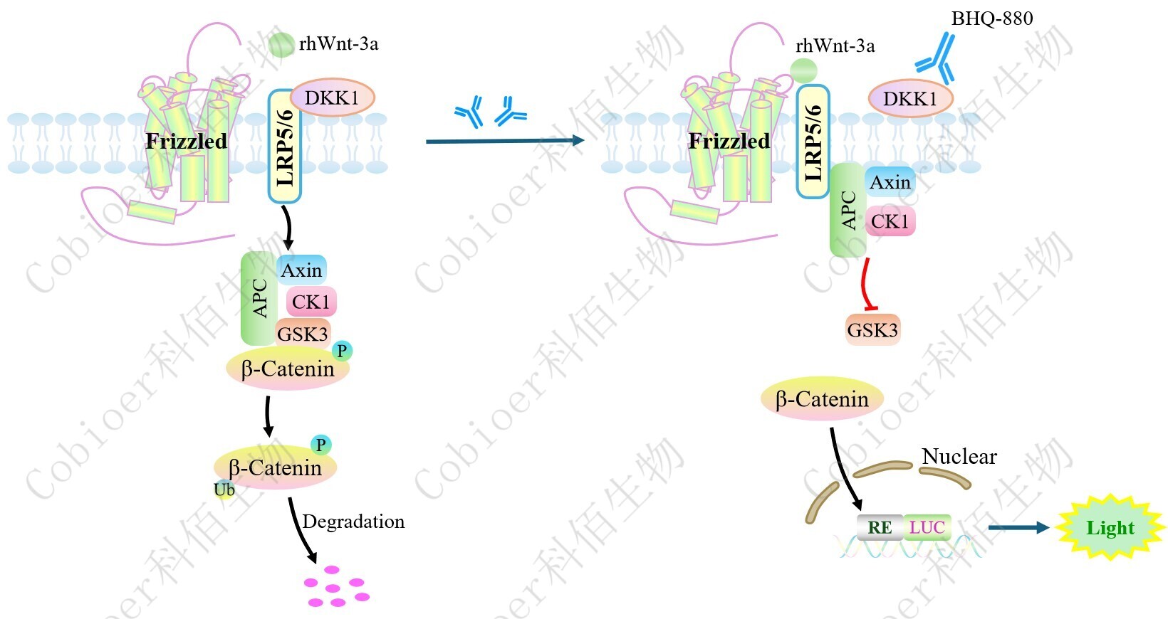 DKK1 Effector Reporter Cell 報(bào)告基因藥靶模型很好的模擬了體內(nèi) WNT 的信號轉(zhuǎn)導(dǎo)過程,原理見下圖所示。![]() Figure 1. DKK1 Effector Reporter Cell 模型原理圖 |