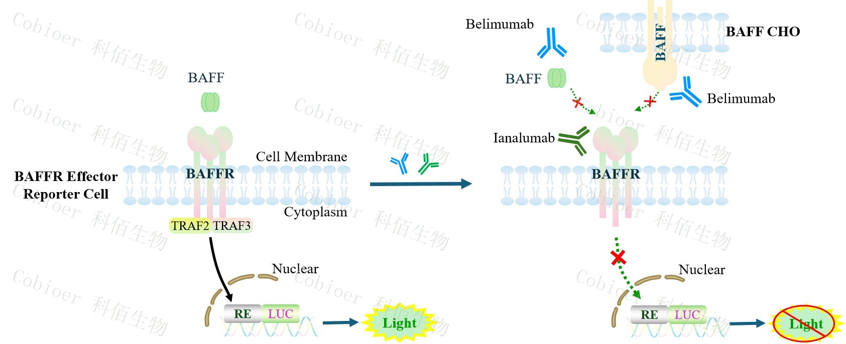 BAFFR Effector Reporter Cell 報告基因藥靶模型很好的模擬了體內(nèi) BAFF 的信號轉(zhuǎn)導(dǎo)過程,原理見下圖所示。![]() Figure 1. BAFFR Effector Reporter Cell 細(xì)胞模型原理圖 |