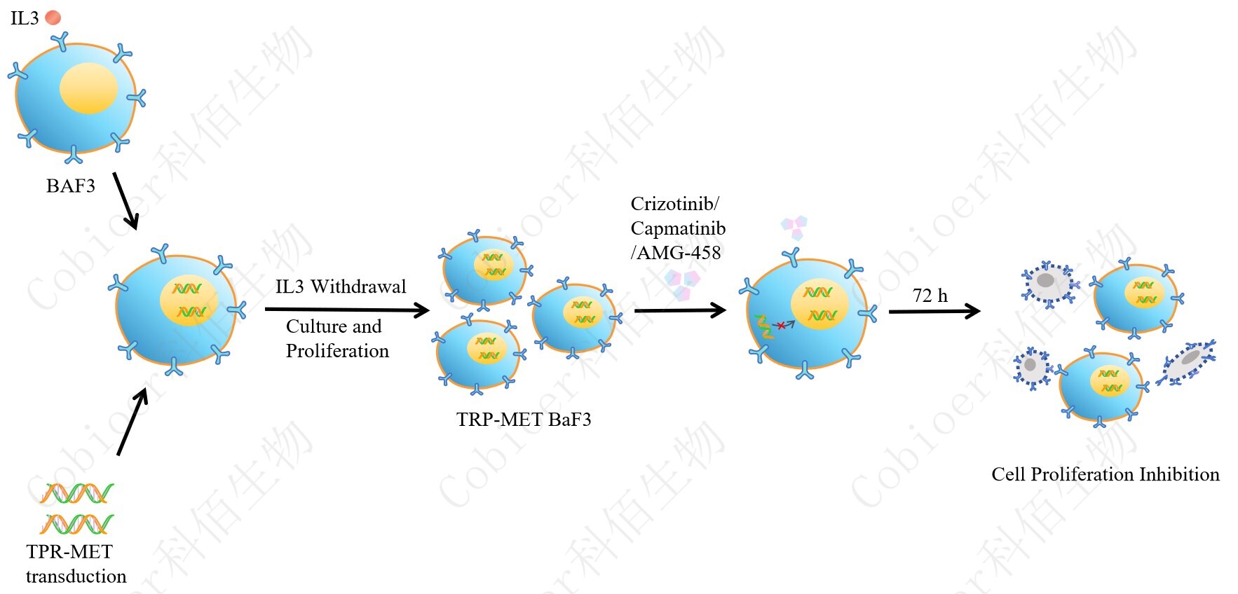 BaF3(小鼠原 B 細(xì)胞)的生長(zhǎng)和增殖需要 IL-3 的維持。通過(guò)引入各種表達(dá)激酶的基因, 能作為 BaF3 的驅(qū)動(dòng)基因,讓 BaF3 不再依賴 IL-3 而增殖,進(jìn)而激酶基因成為 BaF3 增殖依 賴的驅(qū)動(dòng)基因,用于評(píng)估小分子藥物對(duì)激酶的靶向抑制作用,原理及流程見(jiàn)下圖所示。![]() Figure 1. TPR-MET BaF3 細(xì)胞的構(gòu)建原理圖 |