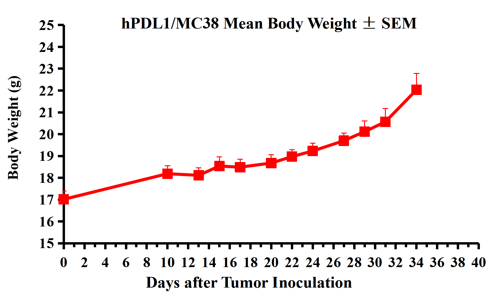 Figure 2. hPDL1/MC38 Mean Body Weight ± SEM.