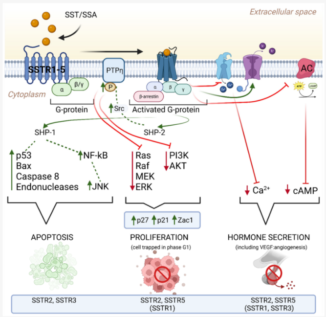 SSTR2與其它同家族受體一樣,在結(jié)合內(nèi)源性多肽配體SST后可以與Gi蛋白偶聯(lián),通過調(diào)節(jié)腺苷酸環(huán)化酶活性進而抑制環(huán)腺苷酸的合成,將外源信號傳遞至胞內(nèi),從而參與調(diào)節(jié)多種激素的分泌,抑制細胞生長增殖。SSTR還能激活K通道,促進細胞膜超極化,抑制門控Ca2+通道的激活,進而阻礙Ca2+內(nèi)流,抑制胞吐,抑制荷爾蒙的分泌功能。當SSTR2或其它亞型與SST結(jié)合后,可以通過蛋白酪氨酸磷酸途徑,SSTR導致蛋白酪氨酸磷酸酶(PTP)上調(diào),使酪氨酸激酶去磷酸化而失活,并抑制促絲裂原活化蛋白激酶(MAPK)等多種蛋白激酶,抑制癌基因、c-fos、c-mys、c-jun等轉(zhuǎn)錄激活,從而抑制DNA和蛋白質(zhì)的合成。