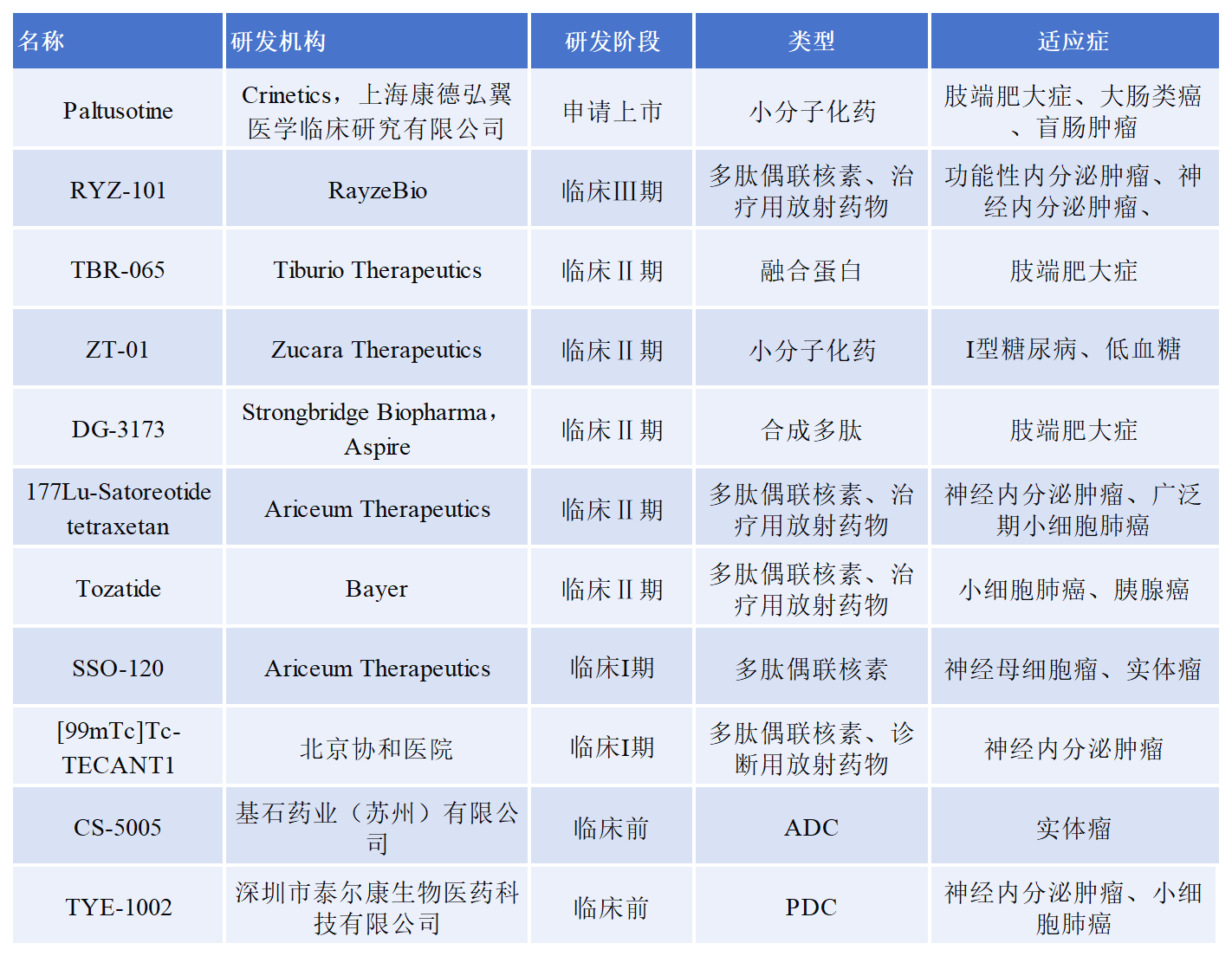 最近,賽諾菲獲得了Zucara Therapeutics公司靶向SSTR2的Ⅰ型糖尿病新藥ZT-01的優(yōu)先談判權(quán)。目前,關于SSTR2靶點有多種藥物在開發(fā),部分在研藥物進展如下: