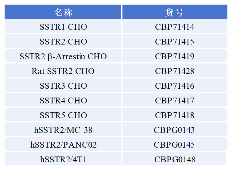 生長抑素受體(Somatostatin receptor,SSTRs)是 GPCR 超家族中的Class A家族的成員,共有 5 種亞型,分別為SSTR1-SSTR5,其中SSTR2是唯一一種有SSTR2a和SSTR2b這2種異構(gòu)體的SSTR亞型受體蛋白。SSTR2廣泛分布于正常組織中,如腦下垂體、胰島、腎上腺、胸腺、胃腸道以及免疫系統(tǒng)等,在不同受體的組織,表達譜各不相同。SSTR2 在神經(jīng)母細胞瘤、垂體腺瘤、黑色素瘤、甲狀腺癌以及許多神經(jīng)內(nèi)分泌腫瘤中高表達。