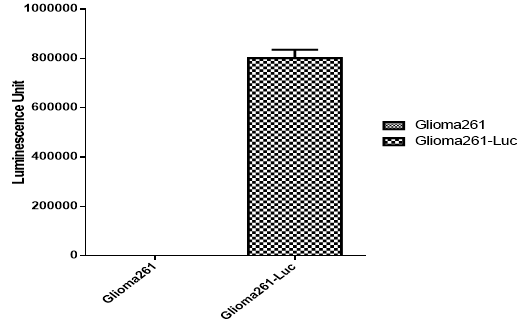 Figure 3. Detect Luciferase assay by Promega Bright-Glo Luciferase Assay System.The number of Luminescence signal is 437±18(Mean±SD) on Glioma261 cells while 787640±28790(Mean±SD) on Glioma261-Luc cells.