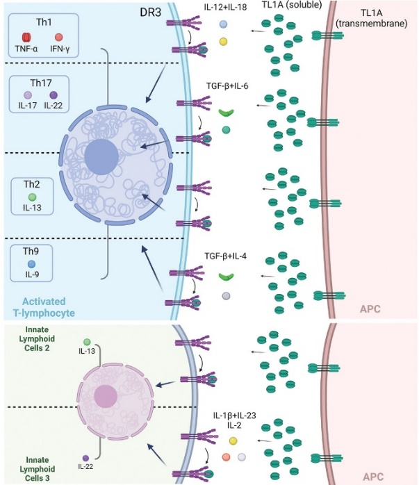 TL1A/DR3信號(hào)的下游作用包括產(chǎn)生幾種關(guān)鍵的因子,如IFN-γ、TNF-α、IL-6和IL-17,以及IL-2、IL-4、IL-13,這些促炎因子表達(dá)上調(diào),并可能產(chǎn)生致病作用。
