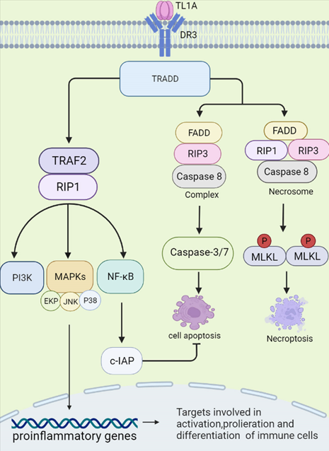 在靜息的T細(xì)胞中,DR3以可溶性形式表達(dá),保護(hù)細(xì)胞免于凋亡?;罨腡細(xì)胞表達(dá)跨膜DR3。sTL1A結(jié)合DR3 (膜結(jié)合形式)激活下游信號(hào)級(jí)聯(lián),從而調(diào)節(jié)免疫反應(yīng)和炎癥。sTL1A/DR3相互作用可觸發(fā)兩種不同的信號(hào)通路,分別引起炎癥和細(xì)胞凋亡。首先,DR3的死亡結(jié)構(gòu)域與細(xì)胞質(zhì)中的適配蛋白TNFR相關(guān)死亡結(jié)構(gòu)域蛋白(TRADD)結(jié)合,然后招募TNFR相關(guān)因子2 (TRAF2)和受體相互作用蛋白1 (RIP1)。這些復(fù)合物激活MAPKs (ERK、p38和JNK)、NF-κB和效應(yīng)激酶PI3K信號(hào)傳導(dǎo)。最后,激活的信號(hào)傳導(dǎo)調(diào)節(jié)促炎基因的表達(dá),參與免疫相關(guān)疾病的發(fā)生。TRADD結(jié)合FAS相關(guān)死亡結(jié)構(gòu)域(FADD)和RIP3,激活半胱氨酸天冬氨酸特異性蛋白酶-8 (caspase-8)形成復(fù)合物,進(jìn)一步激活下游caspase通路(如caspase-3和-7),誘導(dǎo)凋亡細(xì)胞死亡。當(dāng)caspase-8活性被阻斷時(shí),F(xiàn)ADD、RIP3、RIP1與下游效應(yīng)分子混合譜系激酶結(jié)構(gòu)域樣蛋白(mixed lineage kinase domain-like protein, MLKL)在磷酸化后形成胞質(zhì)“壞死體”復(fù)合體。然后,MLKL寡聚到細(xì)胞膜上,導(dǎo)致壞死性細(xì)胞死亡,這是一種伴有強(qiáng)烈炎癥的細(xì)胞死亡形式。在這個(gè)過(guò)程中,NF-κB被證明可以誘導(dǎo)細(xì)胞凋亡抑制蛋白(c-IAP)的激活,從而介導(dǎo)細(xì)胞凋亡的負(fù)反饋調(diào)節(jié)和抑制。事實(shí)上,更多的證據(jù)表明,sTL1A與DR3的連接優(yōu)先誘導(dǎo)淋巴細(xì)胞的促炎途徑而不是凋亡。